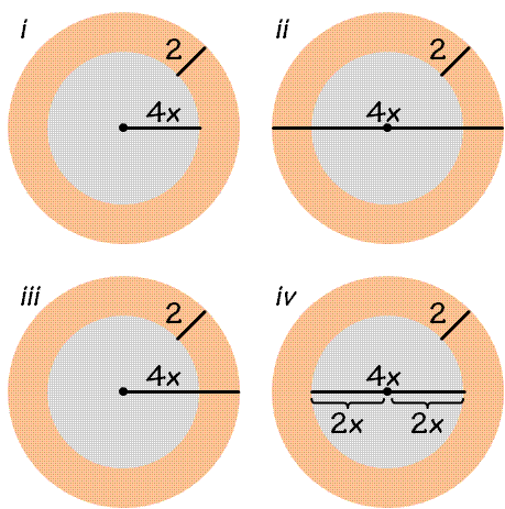 Next, a diameter and a width are given. The 2 inch width is fairly straightforward to fit into the diagram. The width of the orange band can be referred to, but width would not be used to describe a dimension of the glass circle. With respect to the diameter, the words are also clear: the glass center has a diameter of 4x inches. But this is actually where the trouble starts. This question is only one out of 37; we are worried about how much time we spend on any one problem. So, maybe we draw 4x as a radius instead of a diameter (diagram i) , or as the diameter of the whole table instead of only the glass center (diagram ii), or as the radius of the whole table (diagram iii).